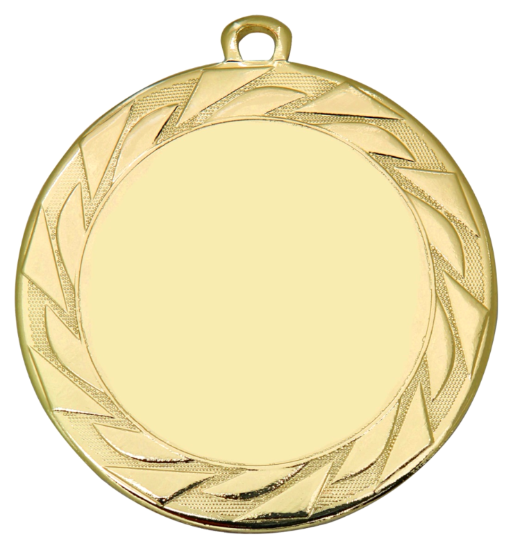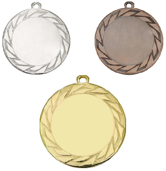 Kvalitets medalje i metal på 70 mm. i diameter, 3D præget specielt mønster rundt langs kanten. Medaljen leveres i guld, sølv og bronze (antikt) Du har mulighed for at tilvælge fra et bredt udvalg af medaljebånd, samt standard emblemer og sportsmotiver (ø50 mm).