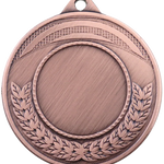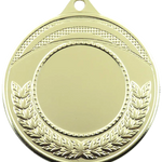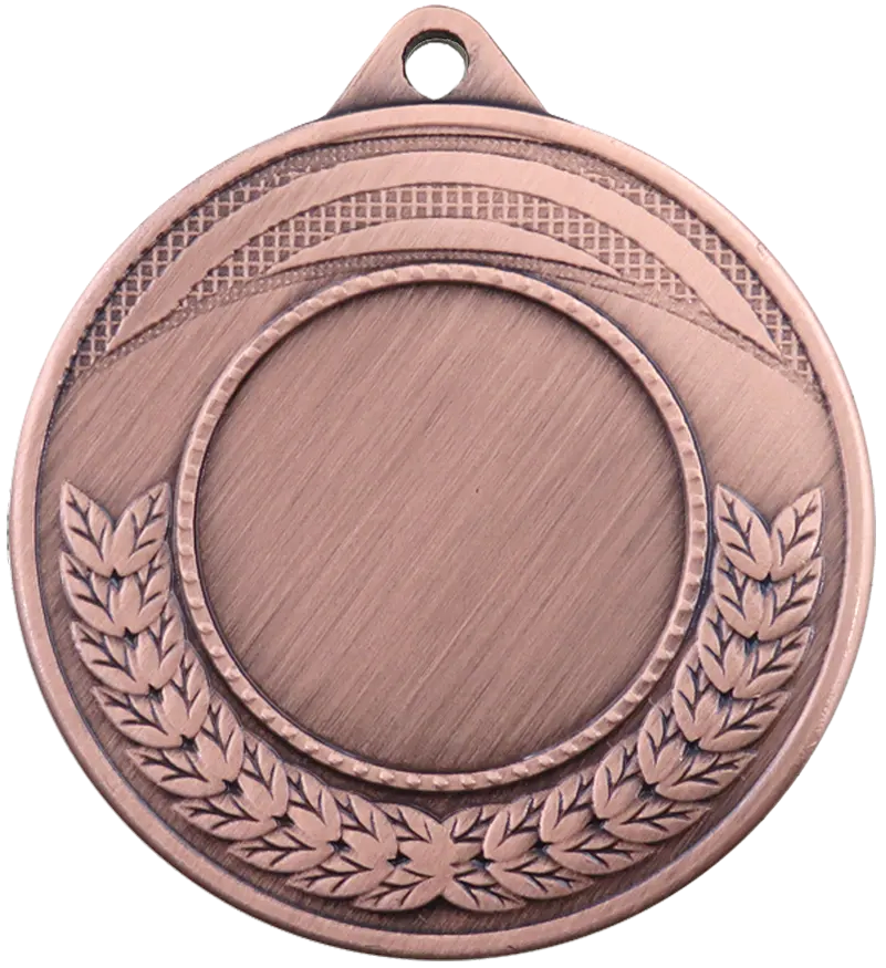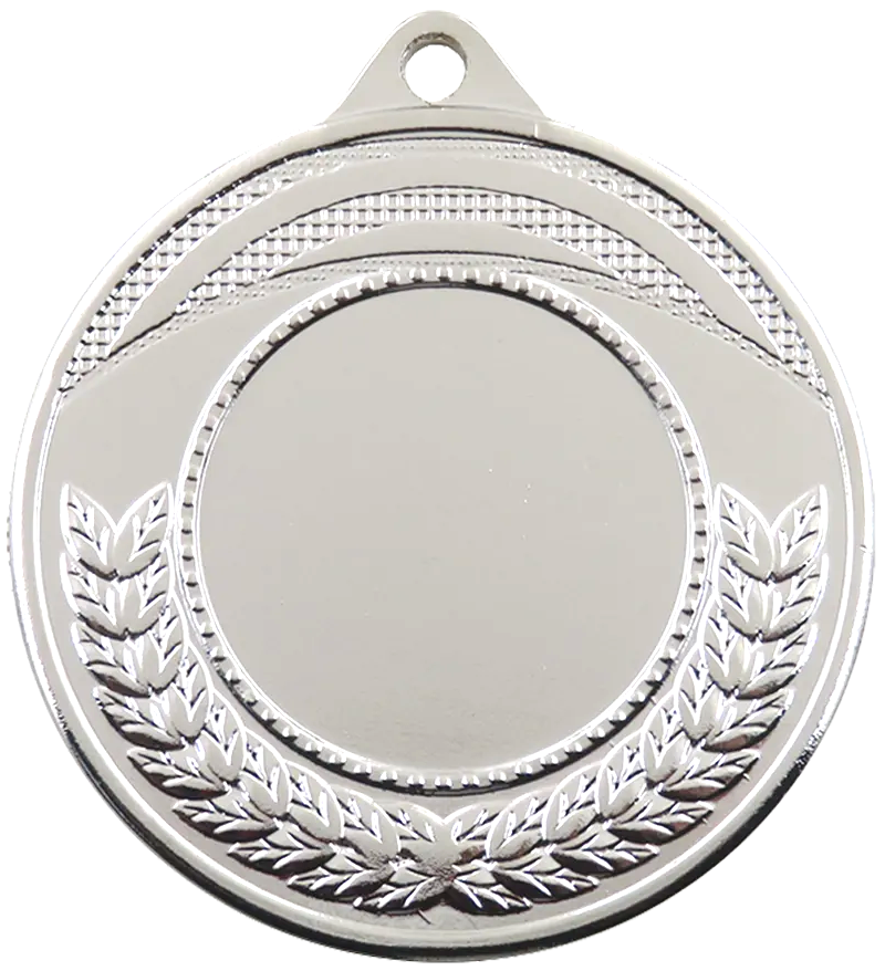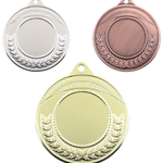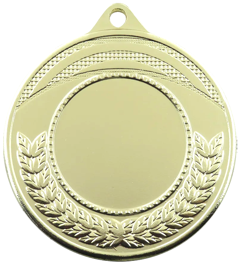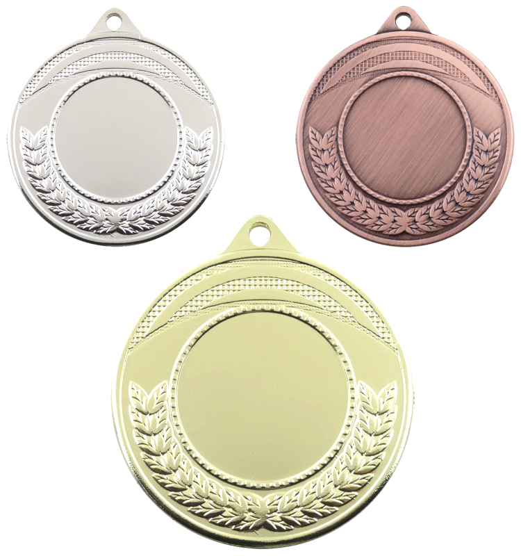 Kvalitets medalje i metal på 45 mm. i diameter, 3D præget med halvkrans af egeløv langs bunden. Medaljen leveres i guld, sølv og bronze, med et bredt udvalg af medaljebånd, samt standard sportsmotiver og emblemer