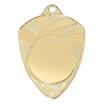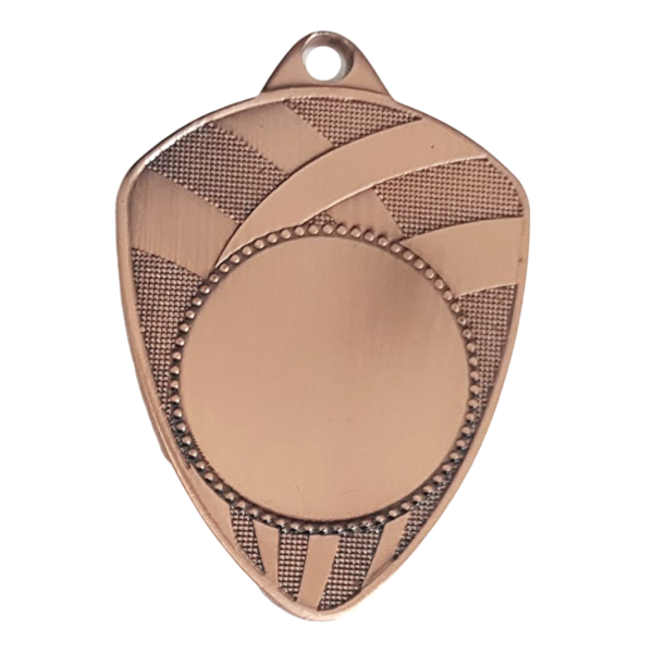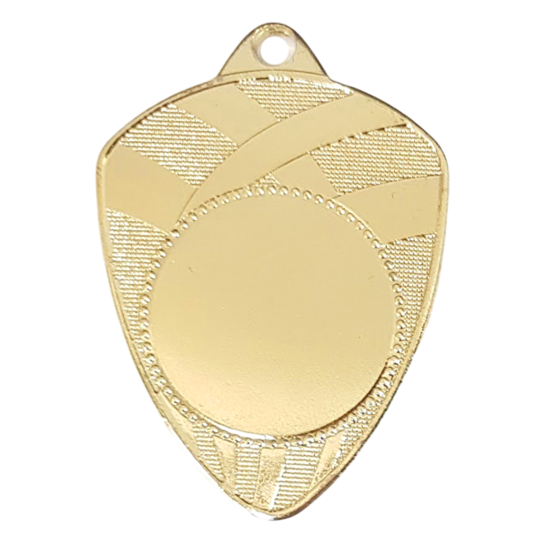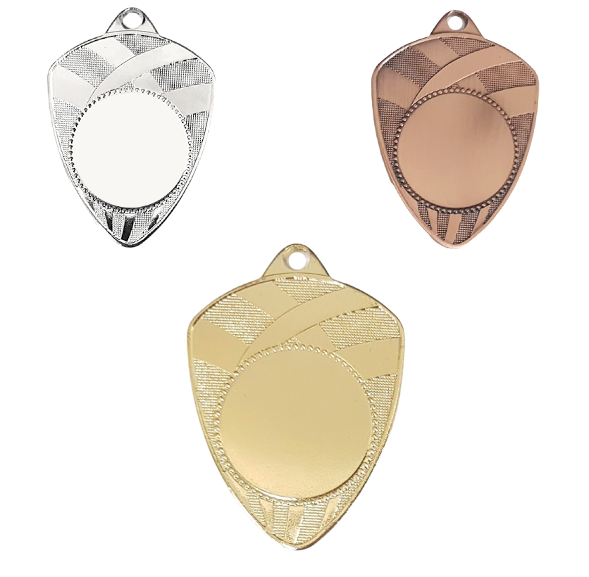 Kvalitets jern medaljen "Mesterskjold", med guld, sølv eller bronze finish. 3D præget med sports bånd og emblem cirkel. Medaljen leveres med et bredt udvalg af medaljebånd samt standard emblemer og sportsmotiver. Moderne og anderledes medalje. Flot design og anderledes medalje.