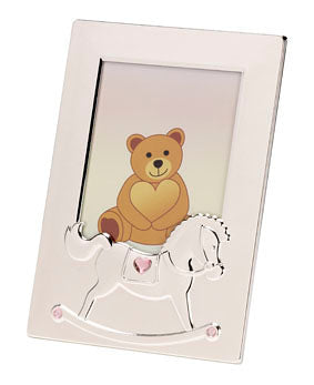 Flot sølvplet billedramme med en sød gyngehest og tre lyserøde facetslebet akrylsten.