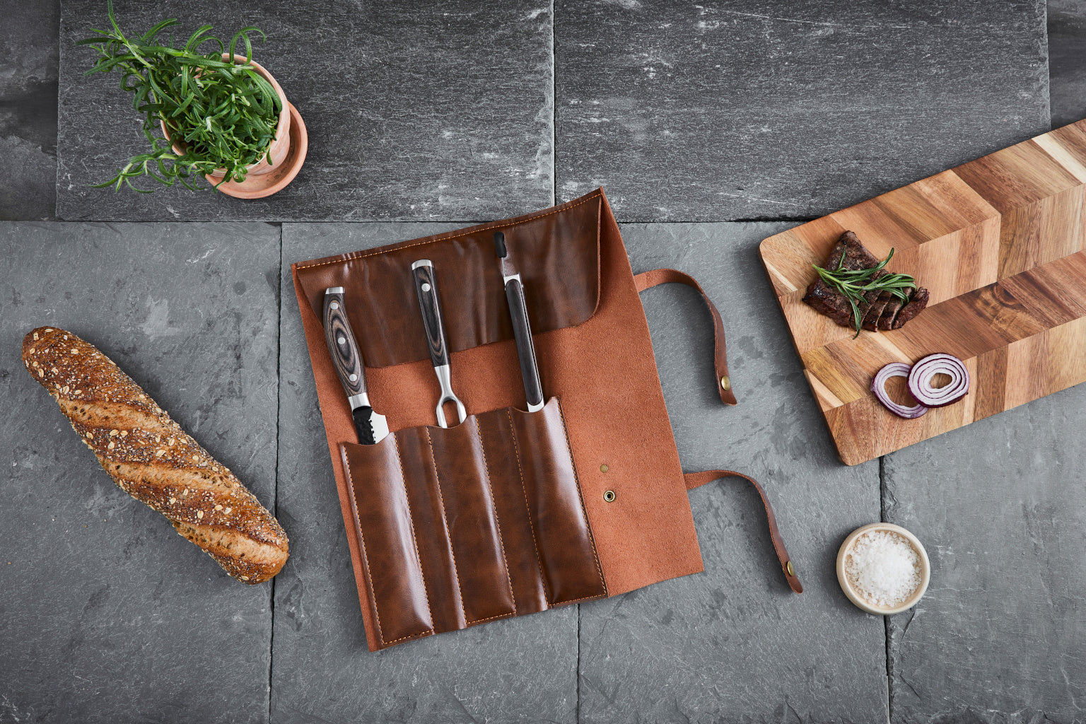 Flot HAŴS SANTO BBQ sæt i 3 dele. Leveres i praktisk læder lomme etui med håndtag. Nemt at transportere hen hvor kødet skal skæres.