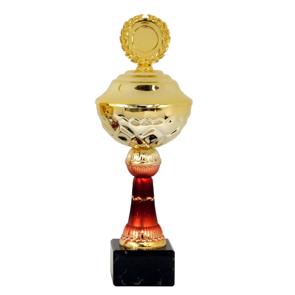 Flot guld chrompokal, som fryder øjet i guld med særpræget rød trompet (Midterstykke)