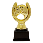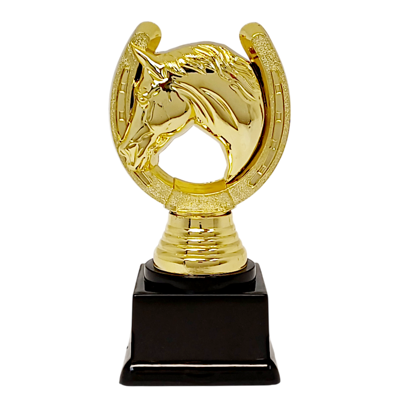 Flot guldfarvet hestehoved i hestesko statuette, støbt i plast. Hestehoved og hestesko på begge sider. Statuetten kan bruges som præmie til alle former for hestearrangementer, som spring, ringridning og generelt hvor hesten er i centrum.